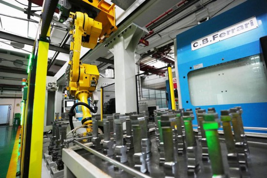 Braço robótico opera em uma linha de produção inteligente da Harbin Turbine Company Ltd. em Harbin, na Província de Heilongjiang, nordeste da China, em 26 de fevereiro de 2025. (Xi…