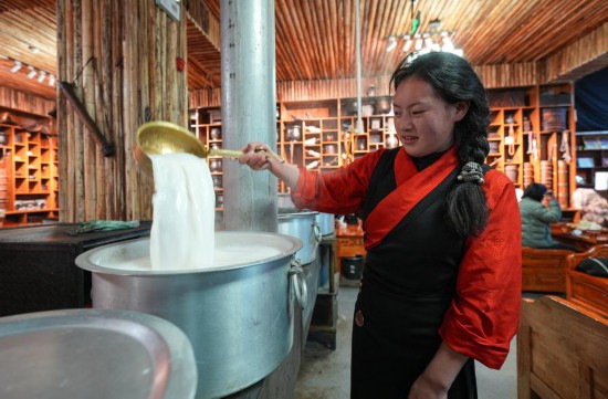 Uma funcionária prepara chá com leite em uma casa de chá de estilo tibetano no distrito de Seni, em Nagqu, na Região Autônoma de Xizang, no sudoeste da China, em 13 de fevereiro de…