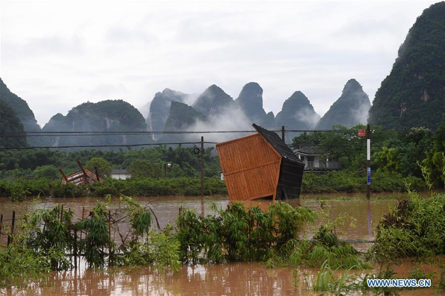 As chuvas também causaram deslizamentos de terra que levaram ao colapso de casas e destruíram estradas no condado de Tianlin, na cidade de Baise.
