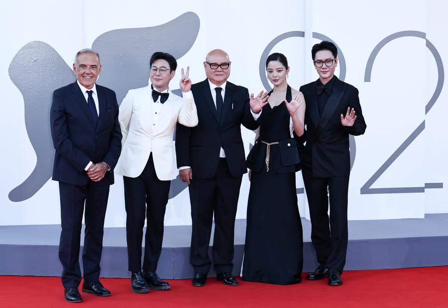 O diretor do Festival de Cinema de Veneza Alberto Barbera (1ª esquerda) e Cai Shangjun (3ª esquerda), diretor do filme "O Sol se Levanta para Todos Nós", com os membros do elenco do filme Zhang Songwen (2ª esquerda), Xin Zhilei (2ª direita) e Feng Shaofeng posam no tapete vermelho da estreia durante o 82º Festival de Cinema de Veneza, em Veneza, Itália, 5 de setembro de 2025. (Xinhua/Li Jing)