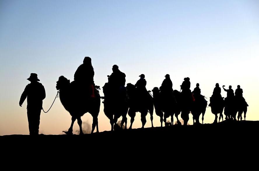 Pessoas percorrem a área cênica de Mingsha de camelo, em Dunhuang, província de Gansu, noroeste da China, em 1º de outubro de 2025. (Foto: Zhang Xiaoliang/Xinhua)