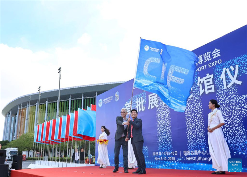 Uma cerimônia que marca a chegada dos produtos da 8ª Exposição Internacional de Importação da China (CIIE) é realizada na praça norte do Centro Nacional de Exposições e Convenções (Shanghai), o principal local da CIIE, em Shanghai, no leste da China, em 23 de outubro de 2025. O primeiro lote de mercadorias s das áreas de Indústria Inteligente e Tecnologia da Informação, Alimentos e Produtos Agrícolas e Equipamentos Médicos e Produtos para a Saúde da 8ª CIIE chegou ao Centro Nacional de Exposições e Convenções (Shanghai) na quinta-feira. (Foto: Fang Zhe/Xinhua)