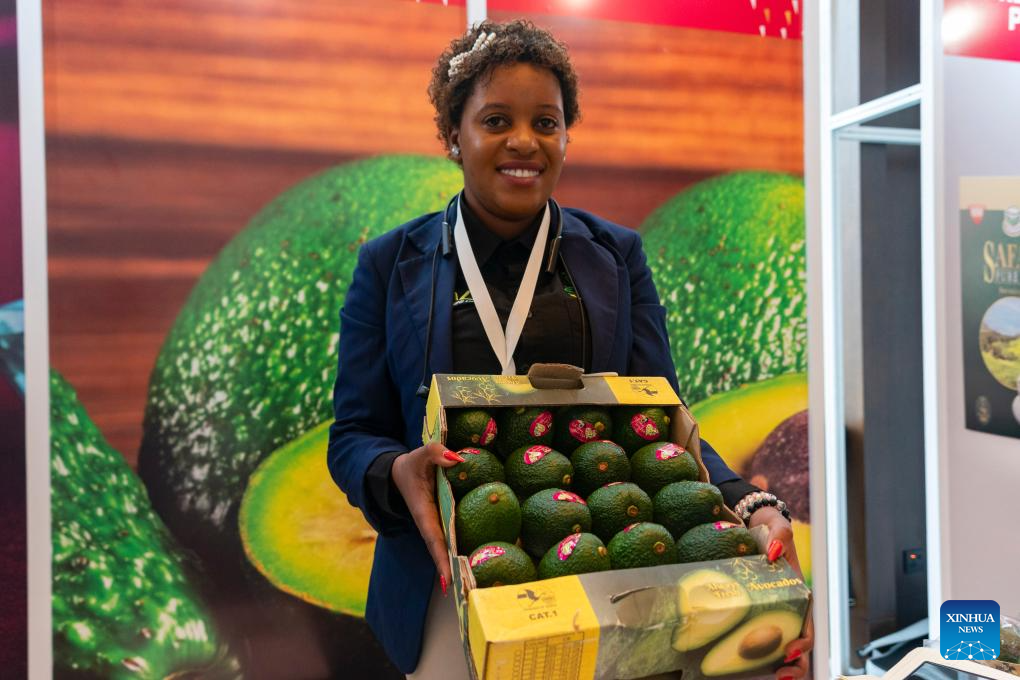 Uma expositora mostra abacates produzidos localmente na exposição do Fórum Empresarial China-Quênia, realizado em Nairóbi, Quênia, em 23 de março de 2026. O Fórum Empresarial China-Quênia foi realizado na segunda-feira em Nairóbi, reunindo mais de 350 representantes dos setores governamental e empresarial de ambos os países para discutir maneiras de fortalecer o comércio e o investimento bilaterais.(Xinhua/Xie Jianfei)